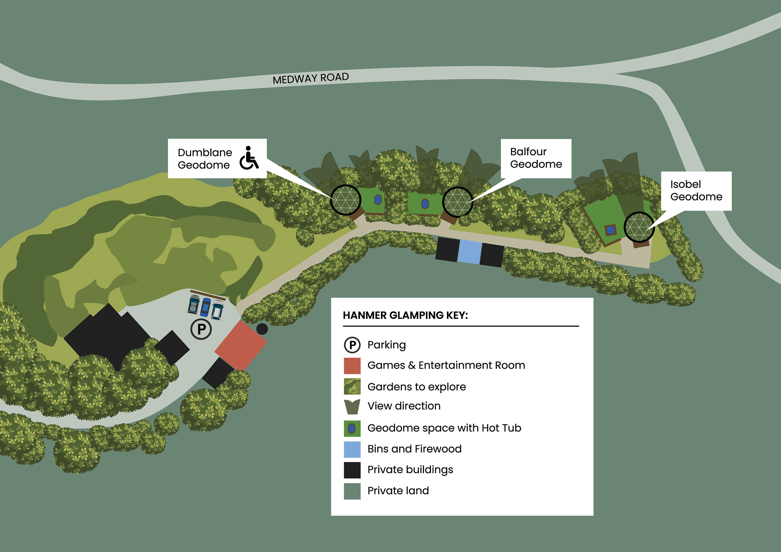When you arrive at Hanmer Glamping you will see an allocated parking space for your Dome tent in the yard at the top of the drive.  See the map.